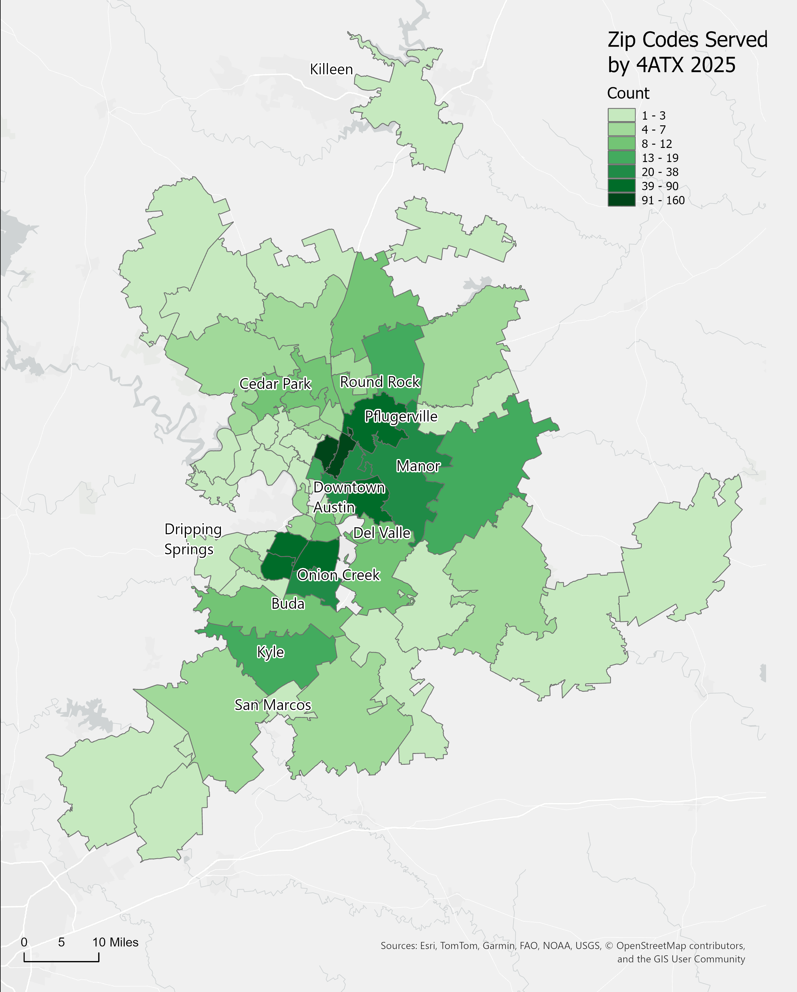 These goals have driven decision-making at every level this year, enabling us to invest intentionally in the people, systems and partnerships that make long-term impact possible. From expanding our internal capacity and Board of Directors to forming new partnerships with dedicated community leaders, we’re positioning 4ATX to better serve Central Texas for years to come.